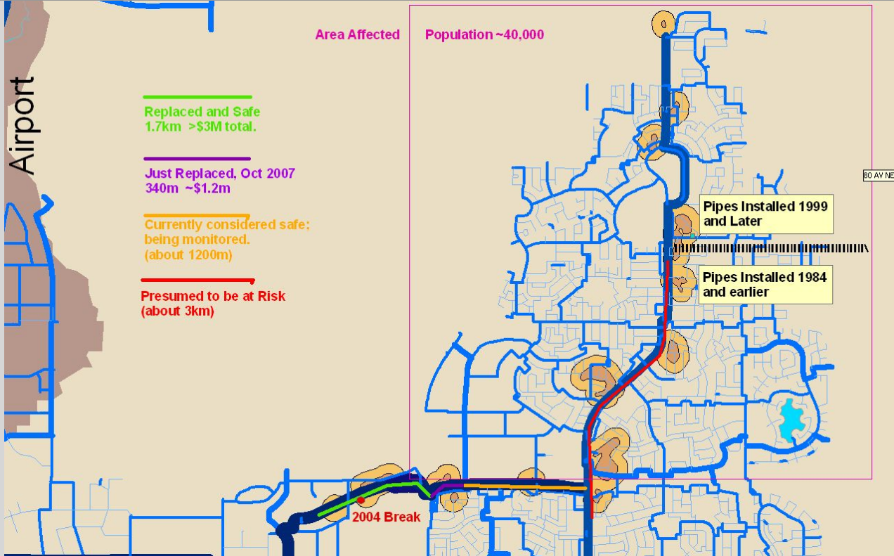 Steel mains are entirely different in failure: just a leak at first, smaller than a dime, and audible. Parenthetically, I predict a bright future for steel feedermain sales in Calgary in future. Maybe for generations.