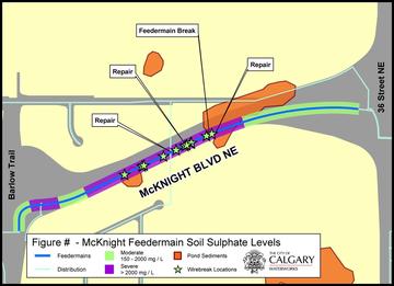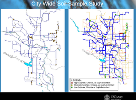The were tests run in 2014, and they weren't alarming, within range of expectations anywhere in Calgary that wasn't pond sediments. Look around the rest of the map, and you see sulphate numbers up around 1000 and 2000, over in the freckled east, and even one 1493, just a half-kilometre north on Crowchild.